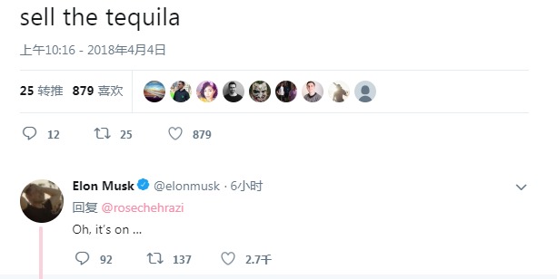 在马斯克的推特账号下,一位网友提醒马斯克说:“卖酒吗?”马斯克在下面回复说:“马上就开卖了!”看来,马斯克晕倒在特斯拉旁边是假消息,但是他身边堆放的Teslaquilla酒瓶则很有可能是真的。